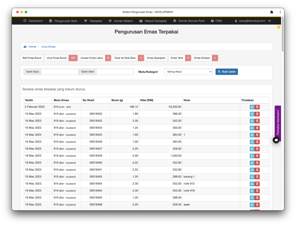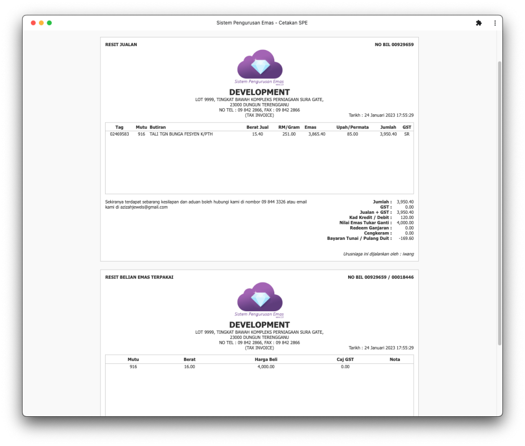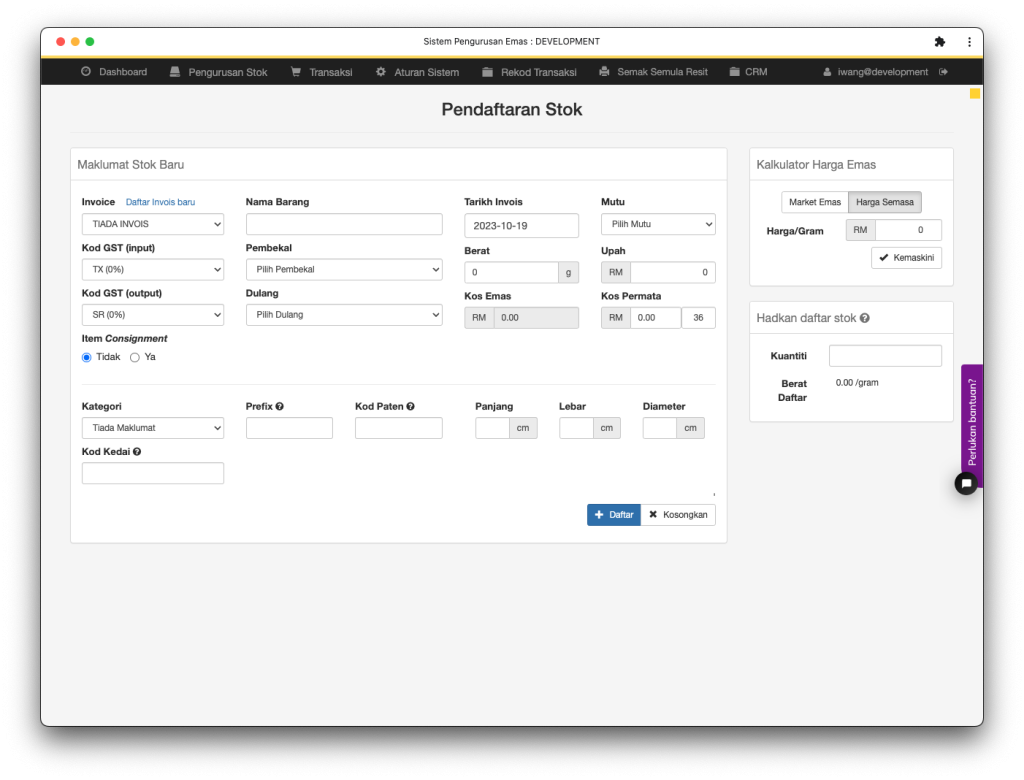 Inventori emas yang didaftarkan untuk dibuat jualan. Stok yang didaftarkan akan mempunyai no tag atau id khas. Daripada tag dan id ini sistem berupaya menghasilkan rekod inventori yang lebih kemas untuk kegunaan pihak kedai.